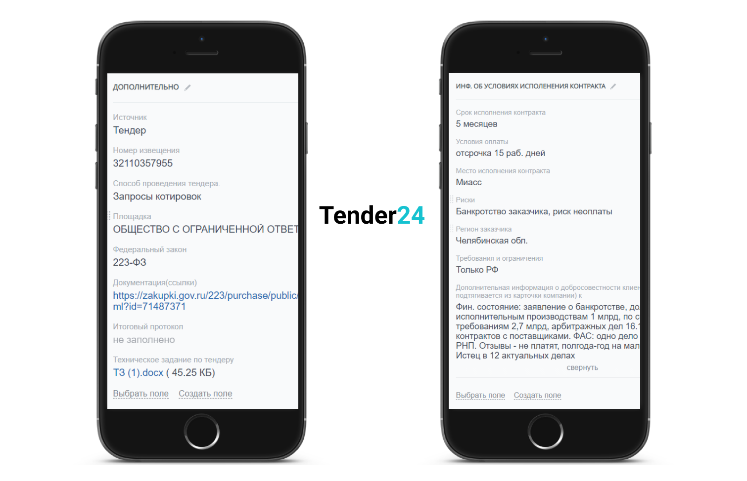 В карточке сделки Вы сможете хранить всю необходимую информацию о тендере, ссылку на него и даже документацию