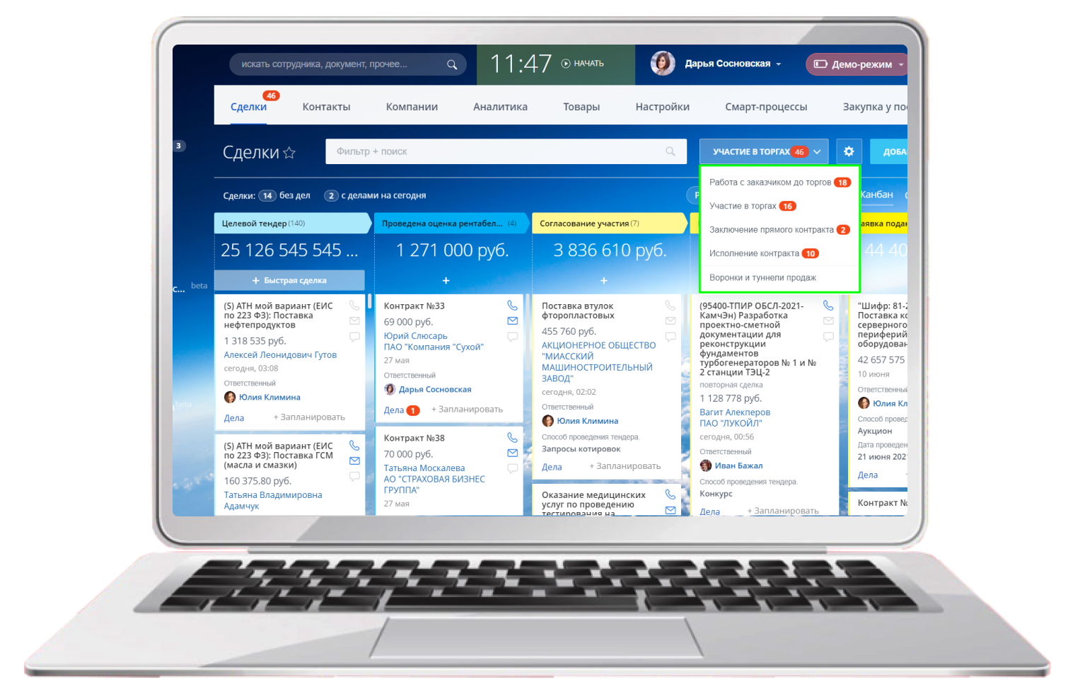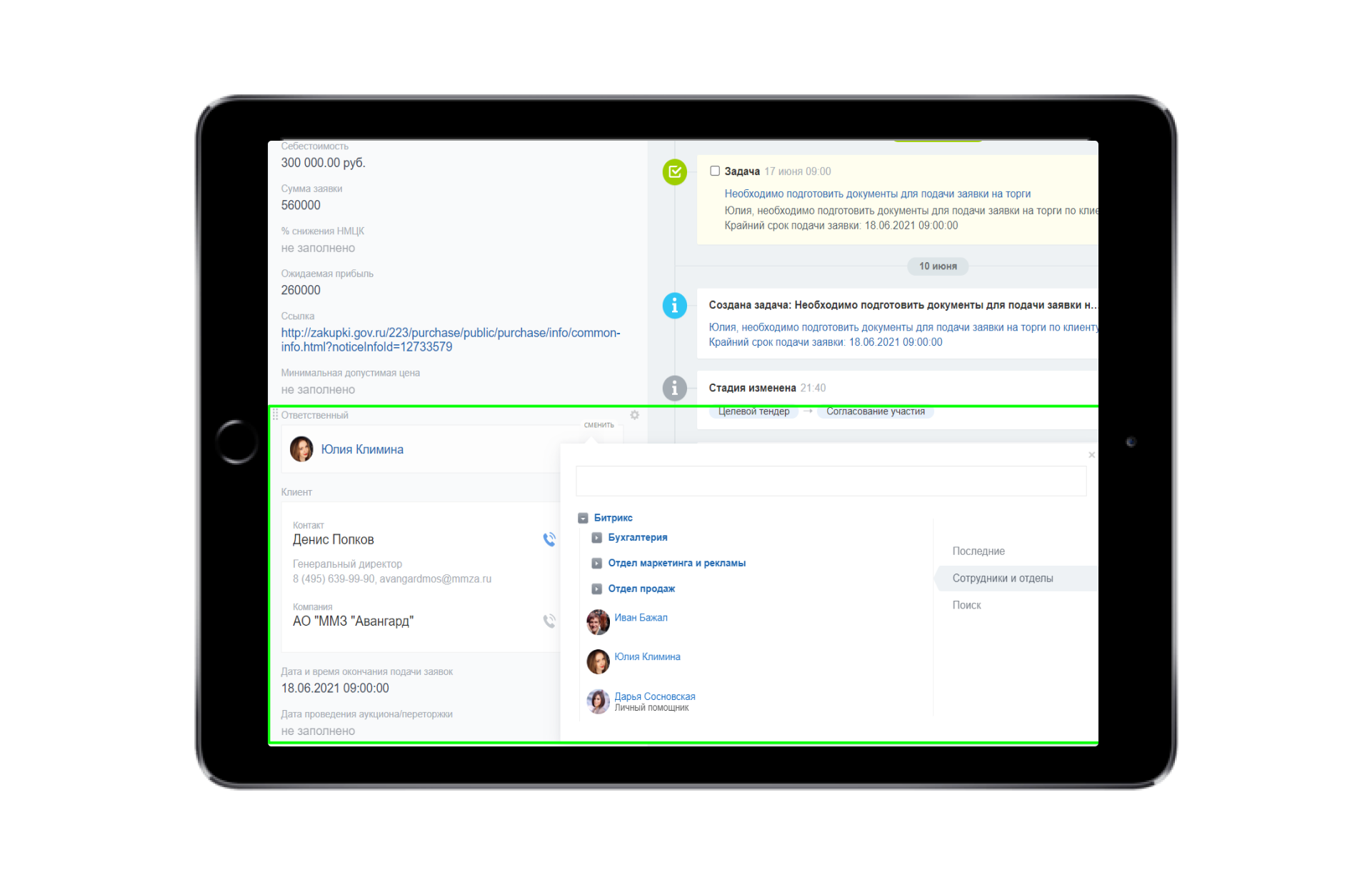 Вы сможете легко распределять большое количество тендеров на ответственных менеджеров и будете уверены, что они приняли сделку в работу.